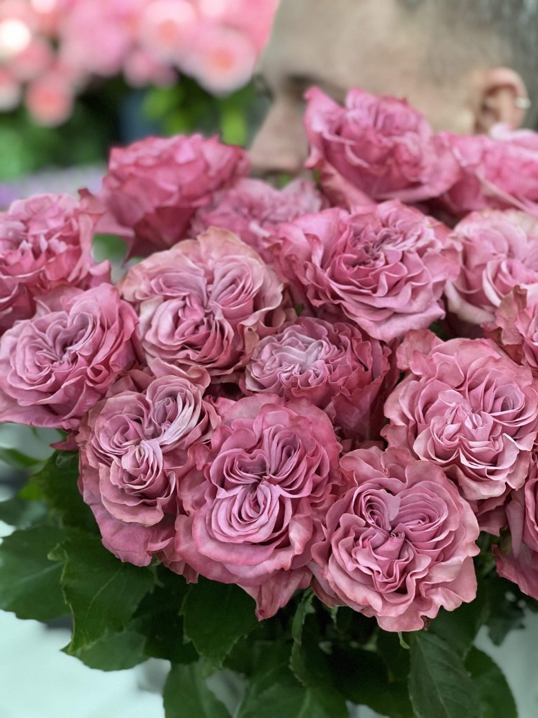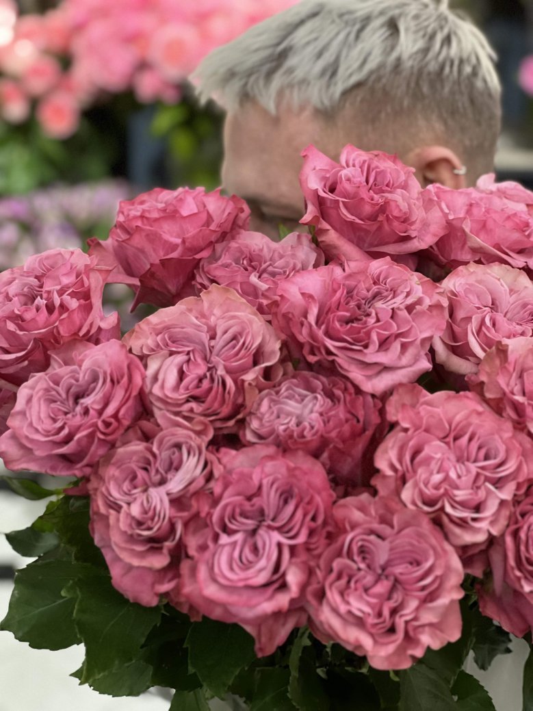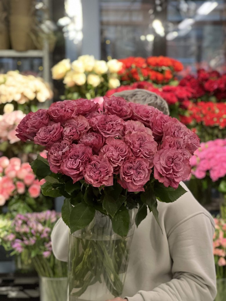 Корзиночка цветов — пионовидные розы, эустомы, ранункулюсы и хелеборум
