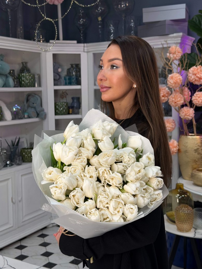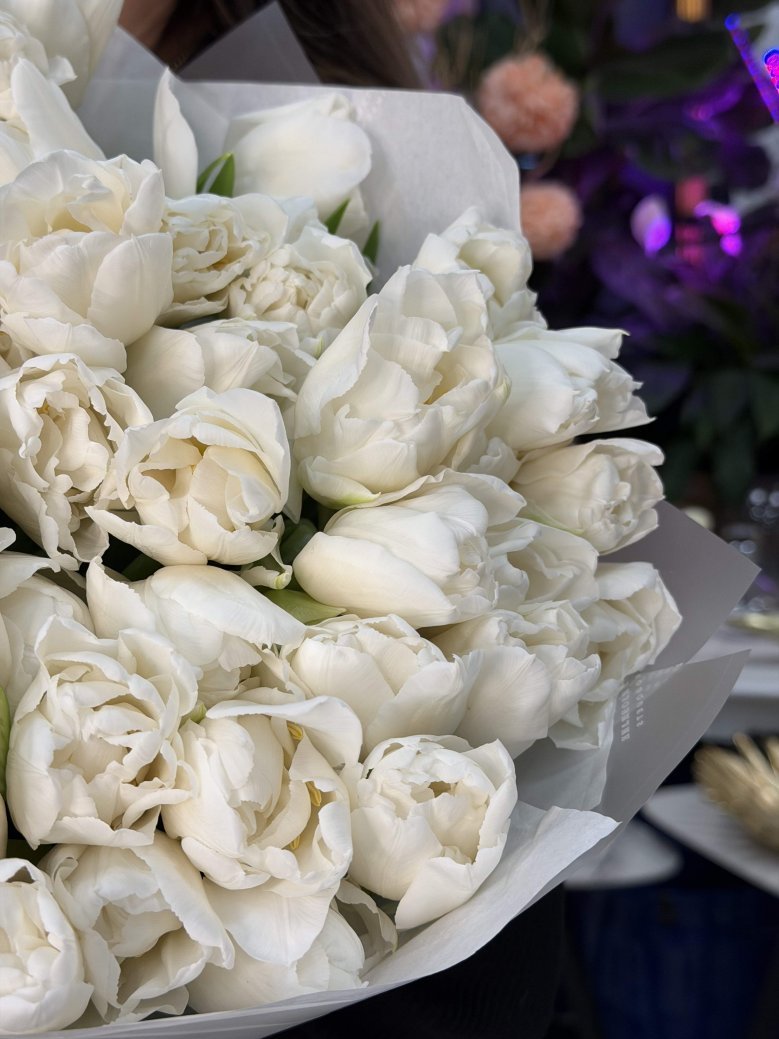 Монобукет из 51 нежных белых пионовидных тюльпанов