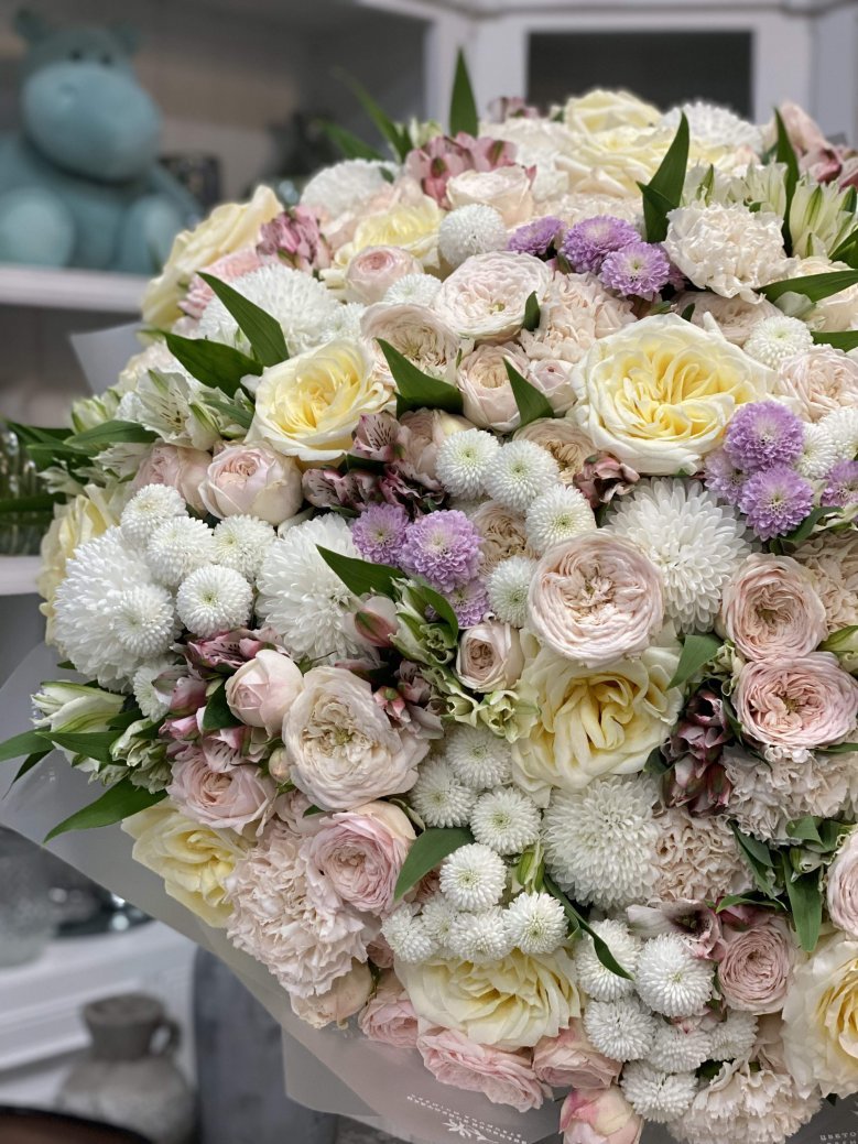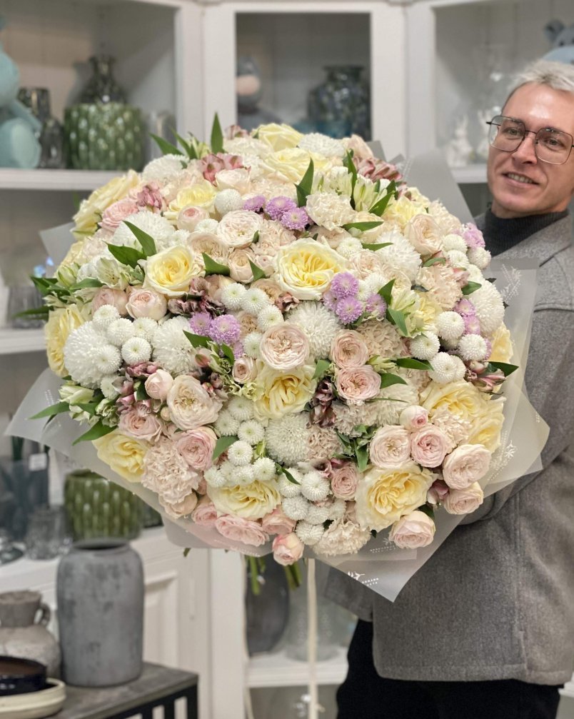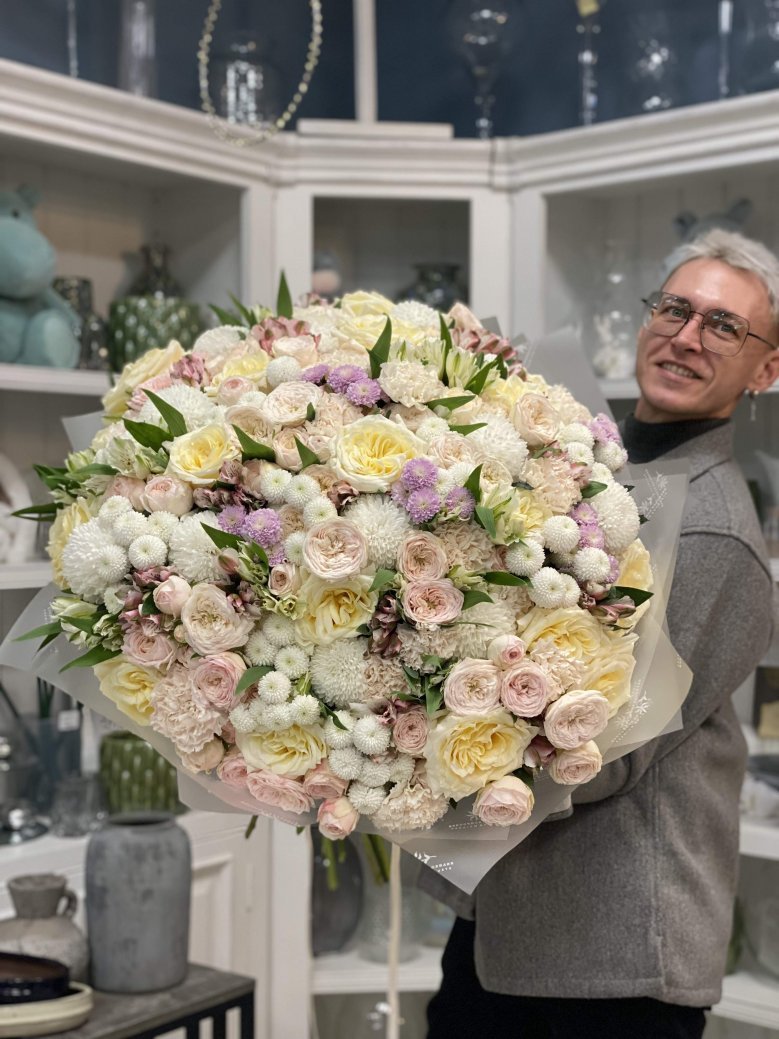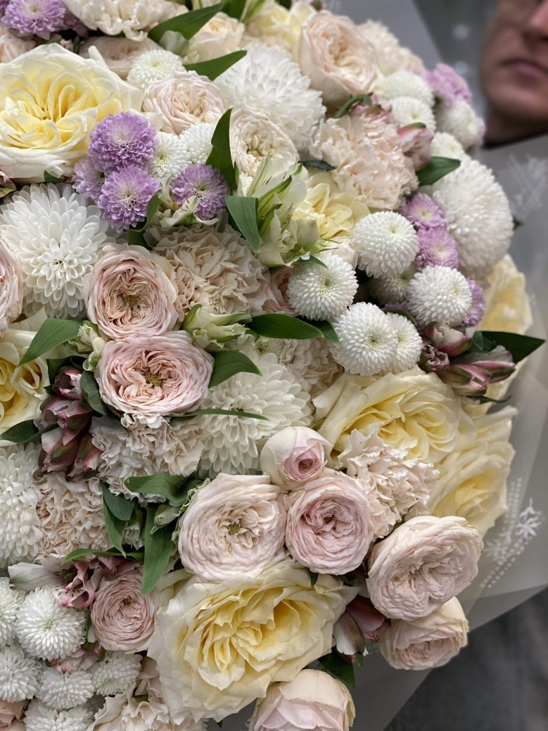 Авторский букет цветов — пионовидная роза, хризантема и диантусы