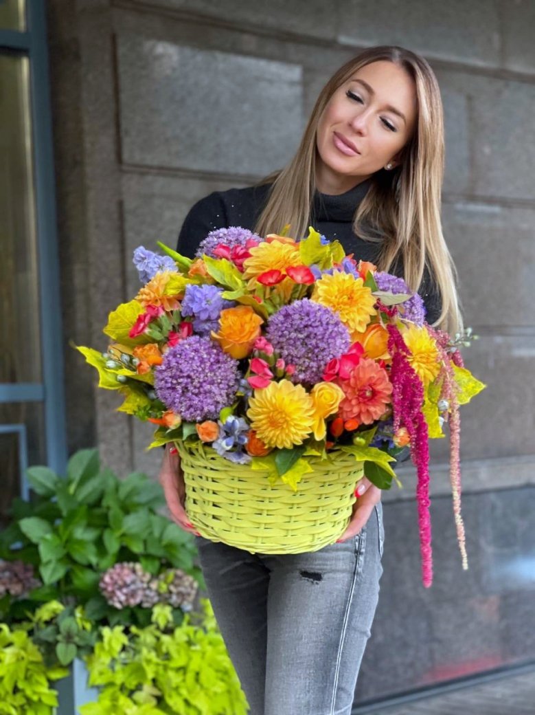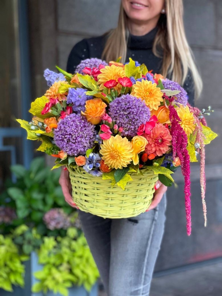 Корзина цветов — георгины, алиумы, амаранты и розы