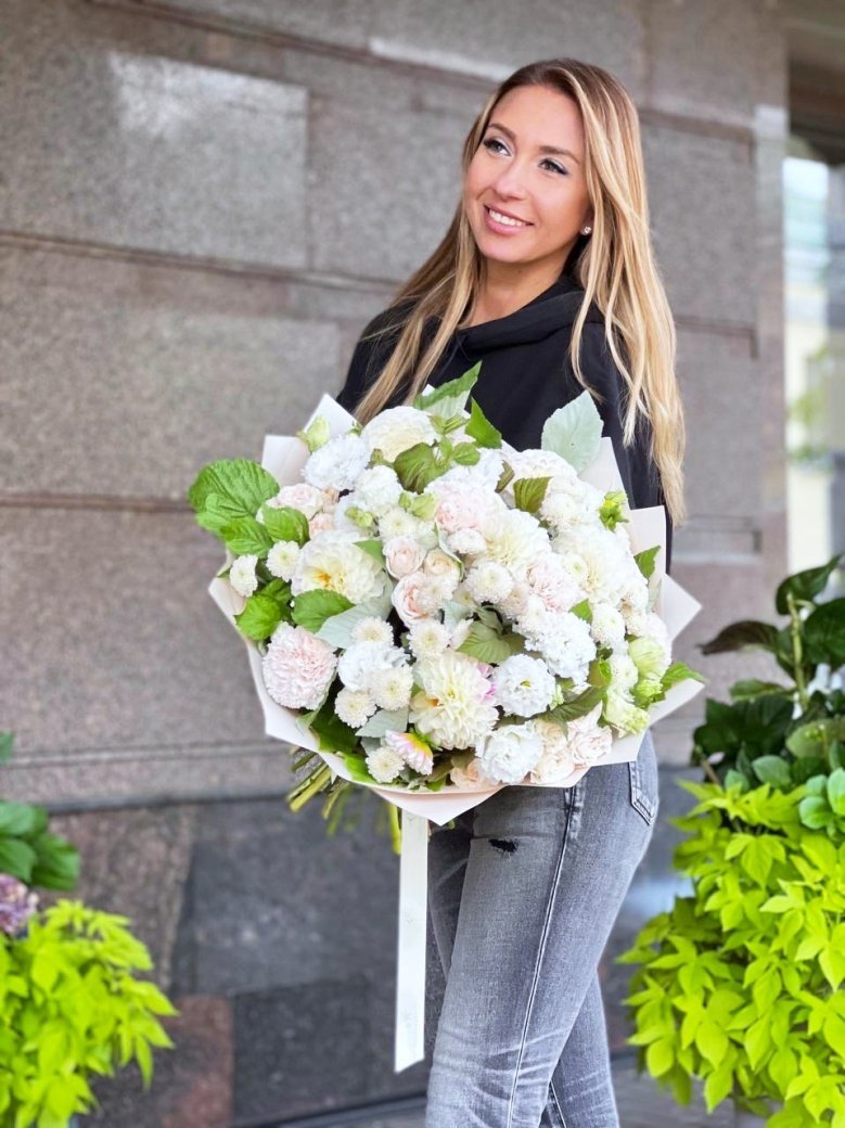 1. Каждый букет уникален и имеет сезонность, поэтому он может отличаться от того, который вы видите на картинке. Мы можем создать композицию в подобном стиле и цвете.