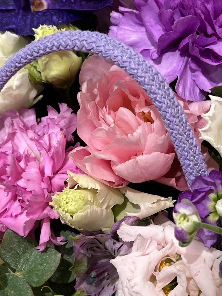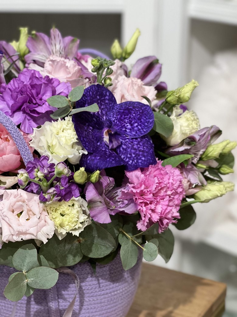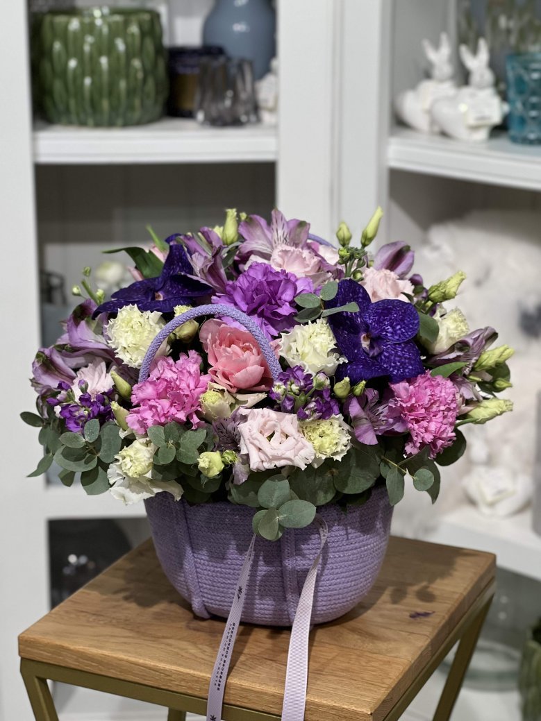 Корзина цветов в сереневых тонах