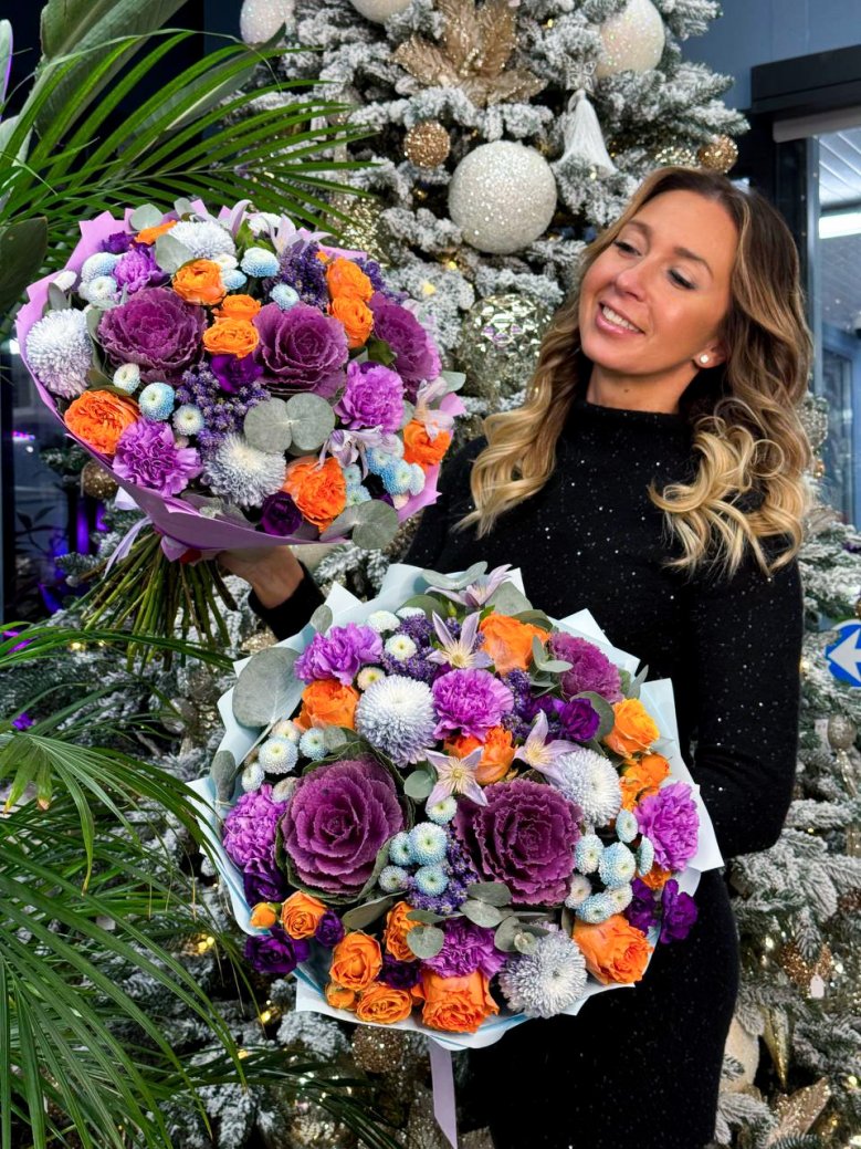 1. Каждый букет уникален и имеет сезонность, поэтому он может отличаться от того, который вы видите на картинке. Мы можем создать композицию в подобном стиле и цвете.