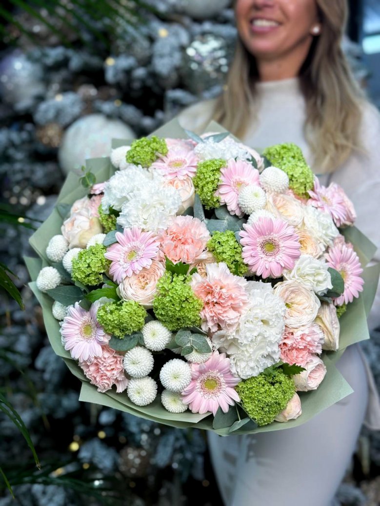 1. Каждый букет уникален и имеет сезонность, поэтому он может отличаться от того, который вы видите на картинке. Мы можем создать композицию в подобном стиле и цвете.