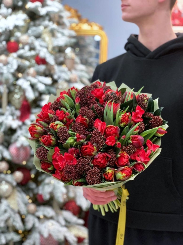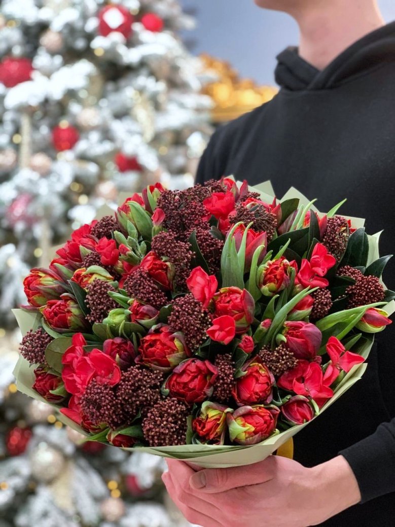 Состав: красный пионовидный тюльпан, скимия и гвоздичка бабочка