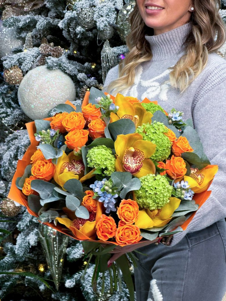 1. Каждый букет уникален и имеет сезонность, поэтому он может отличаться от того, который вы видите на картинке. Мы можем создать композицию в подобном стиле и цвете.