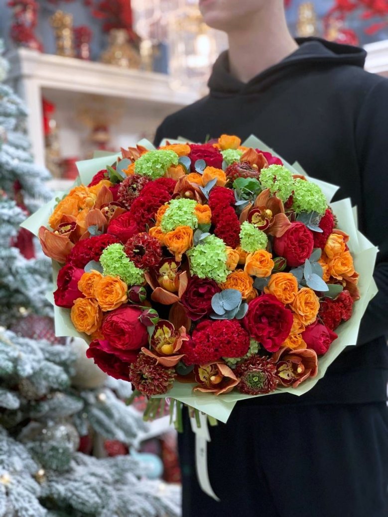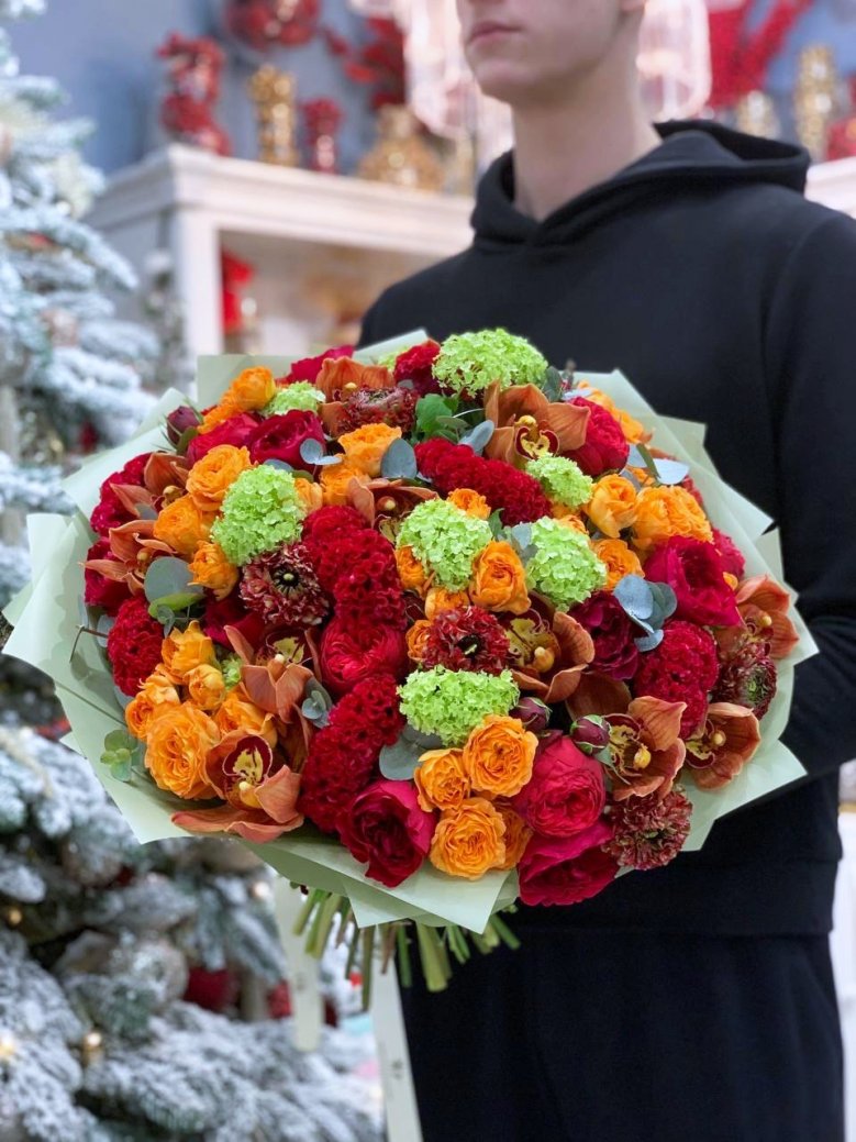 Состав: пионовидная роза, орхидея, ранункулюс и целозия