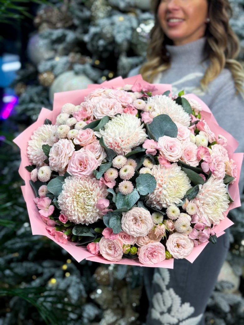 Букет цветов — садовые розы, хризантемы, сантини и гвоздики-бабочки