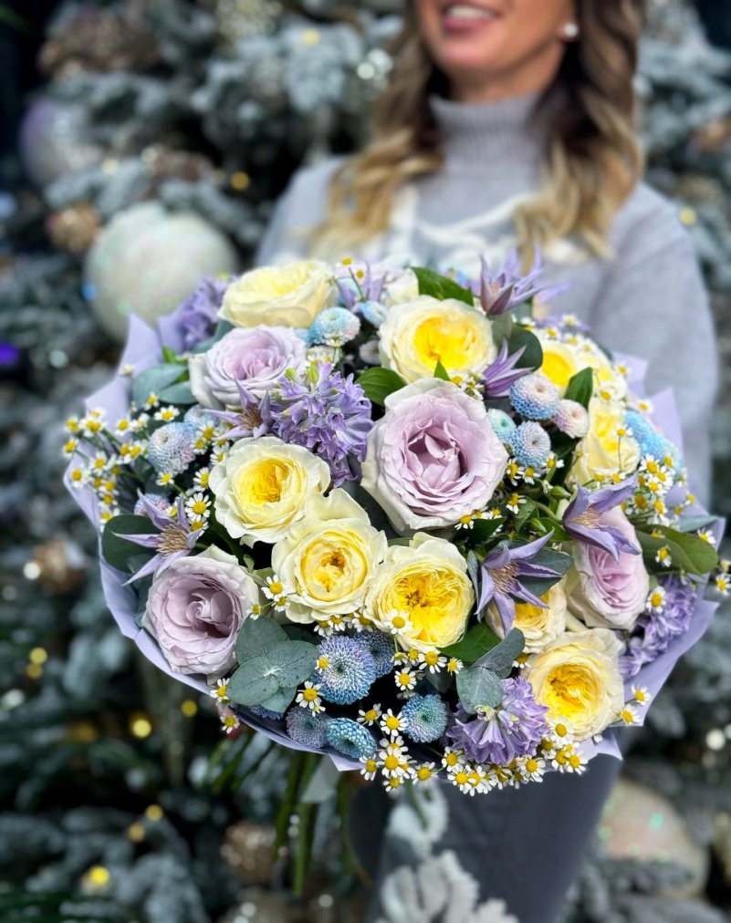 Состав: садовая роза, сантини, гиацинт, ромашка и клематис