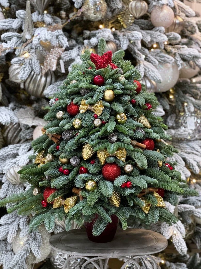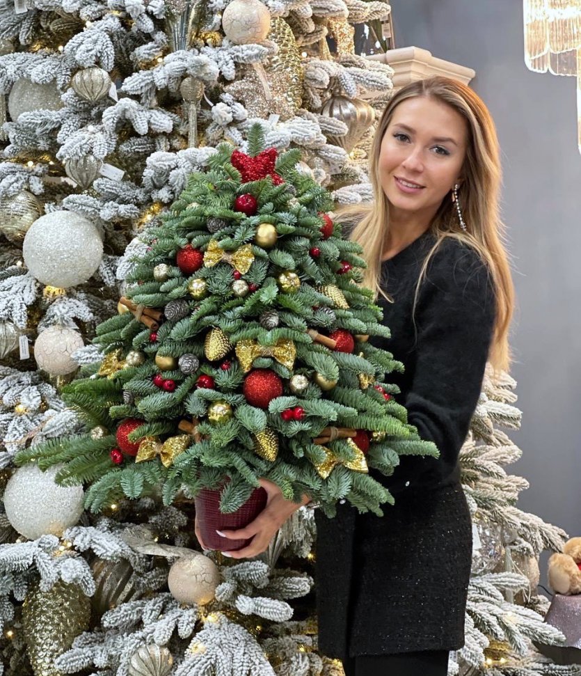 Композиция в шляпной коробке — георгины, вибурнумы, спирея и садовые розы (размер М)