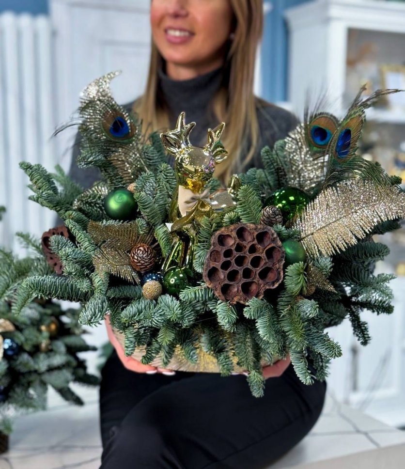 Букет цветов — герберы, пионовидные розы, орхидеи и ягоды илекса