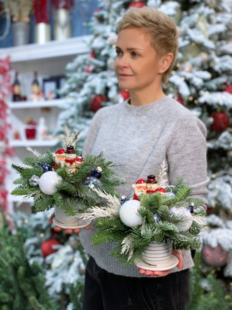 Состав: лапник голубой датской ели (нобилис), керамическая игрушка, декоративные новогодние украшения и кашпо