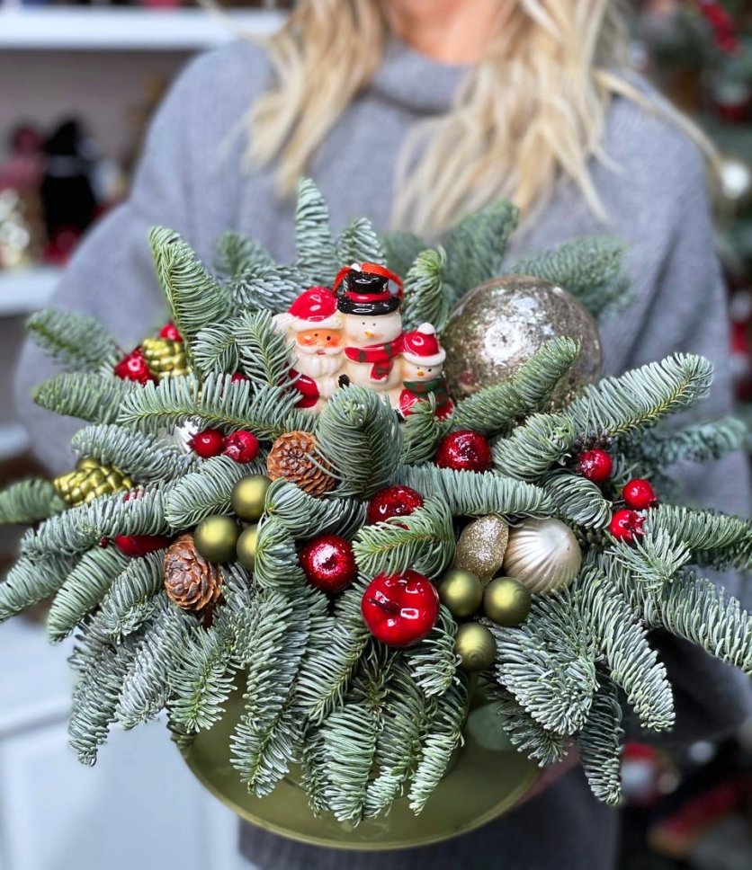 Корзиночка цветов — пионовидные розы, эустомы, ранункулюсы и хелеборум