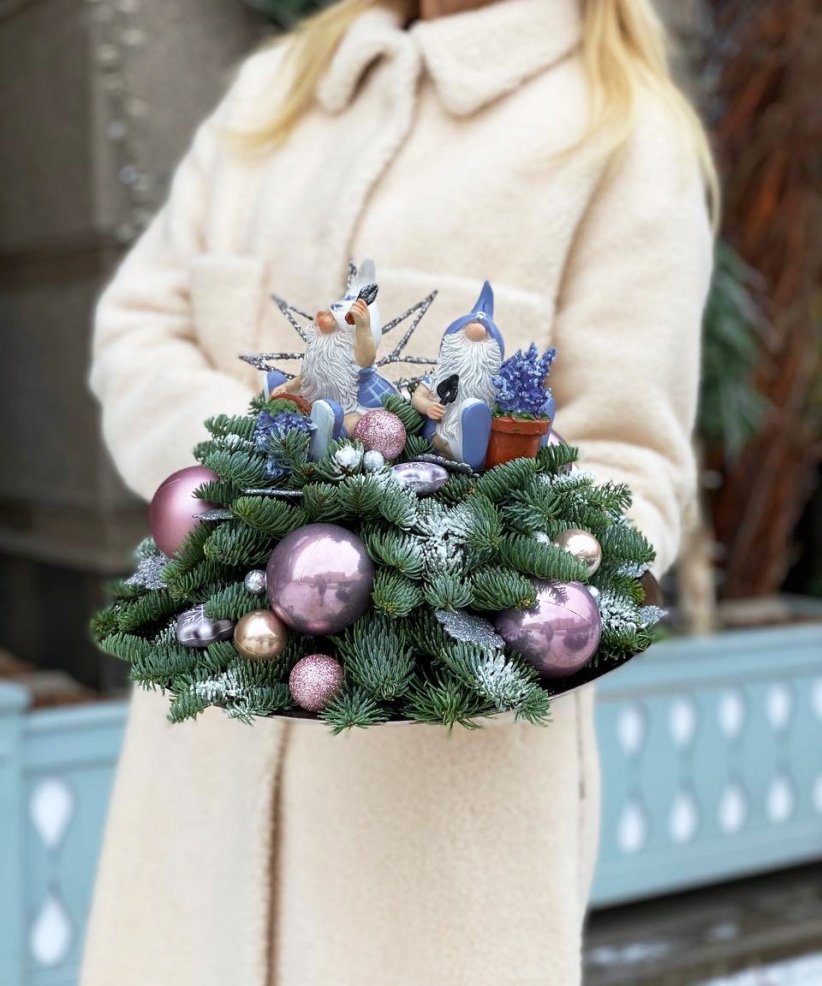 Состав: лапник голубой датской ели (нобилис), декоративные новогодние украшения, фигурка — гномы