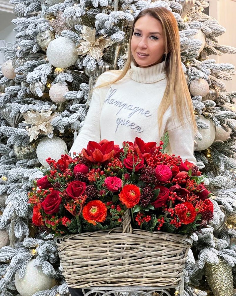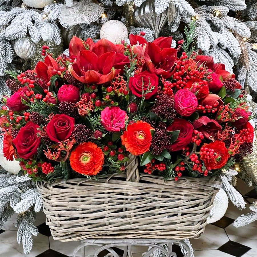 Корзина цветов — ранункулсы, амариллисы и пионовидная роза