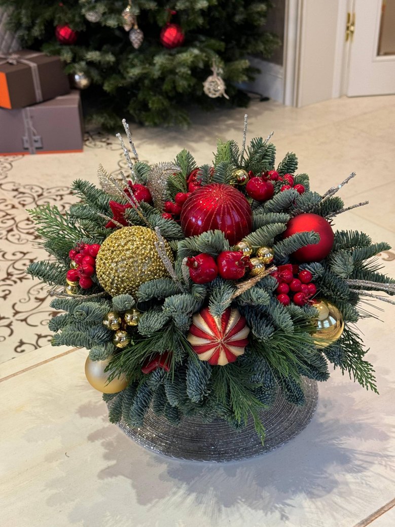 Корзина цветов — пионы, лилии, садовые розы и сантини (размер L)