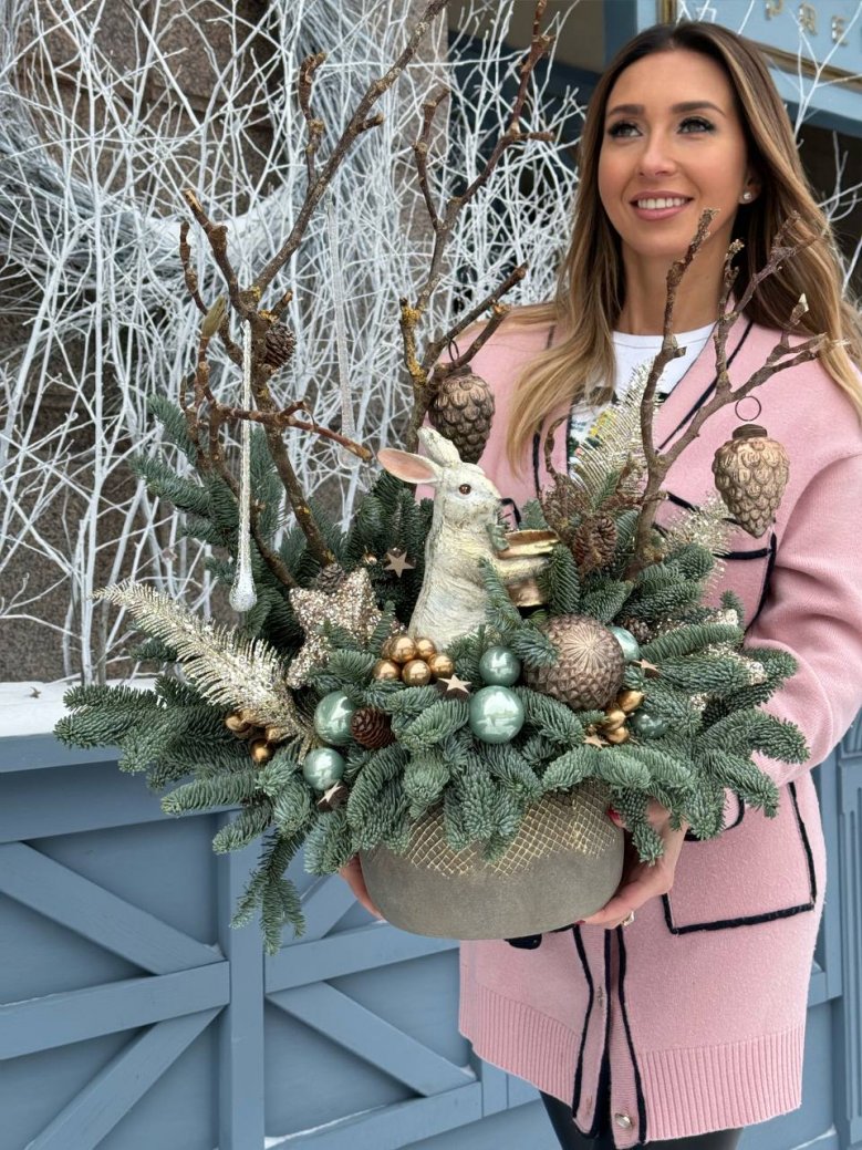 Букет цветов — герберы, пионовидные розы, орхидеи и ягоды илекса