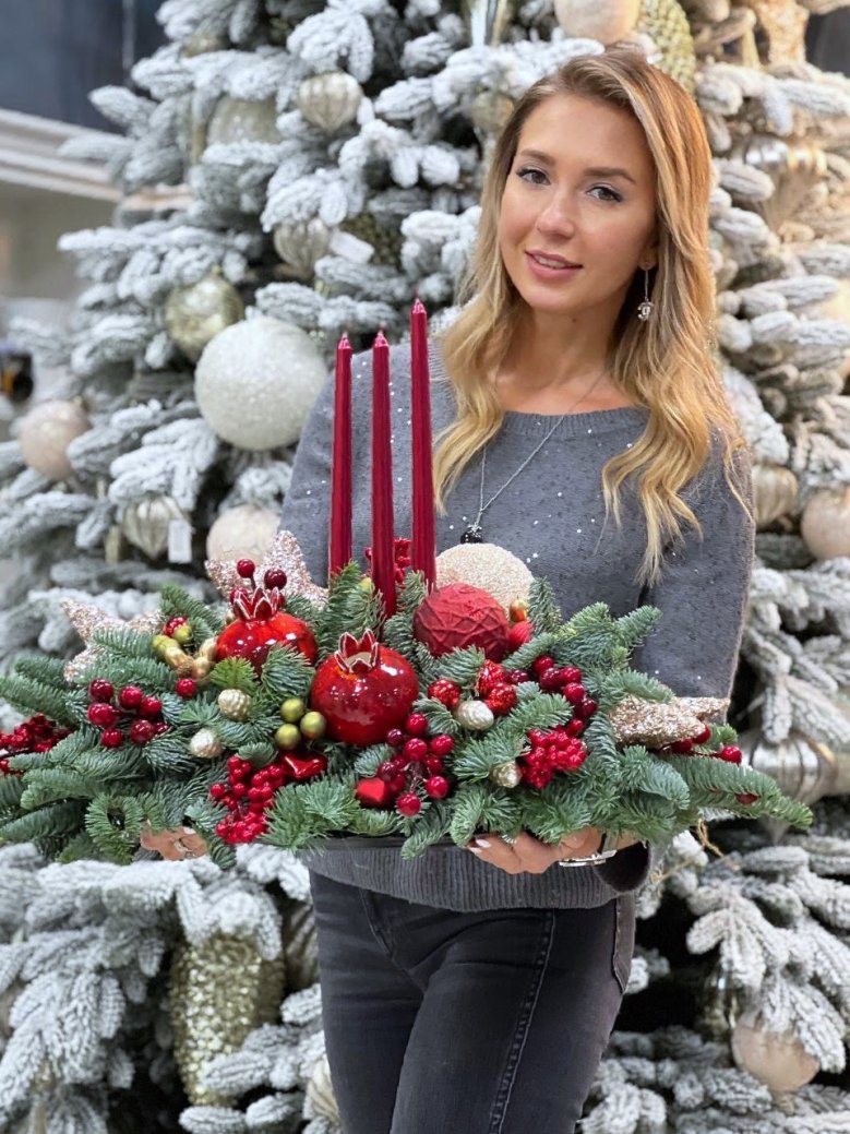Букет цветов — пионовидная роза, кустовая садовая роза, сантини, ежевика и зелень