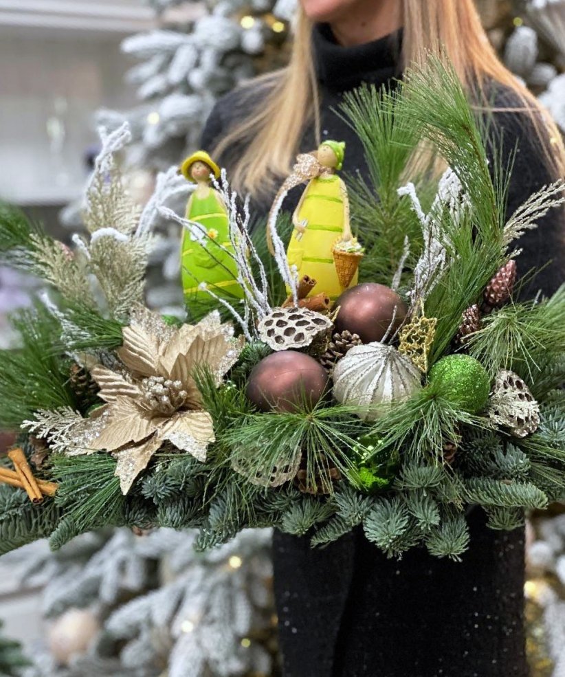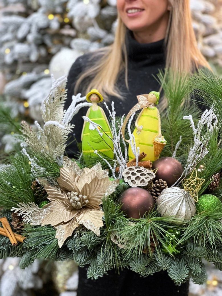 Корзиночка цветов — пионовидные розы, эустомы, ранункулюсы и хелеборум