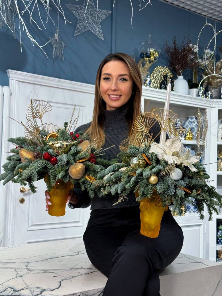Состав: натуральная датская пихта, свечи, дизайнерское кашпо и декоративные новогодние украшения