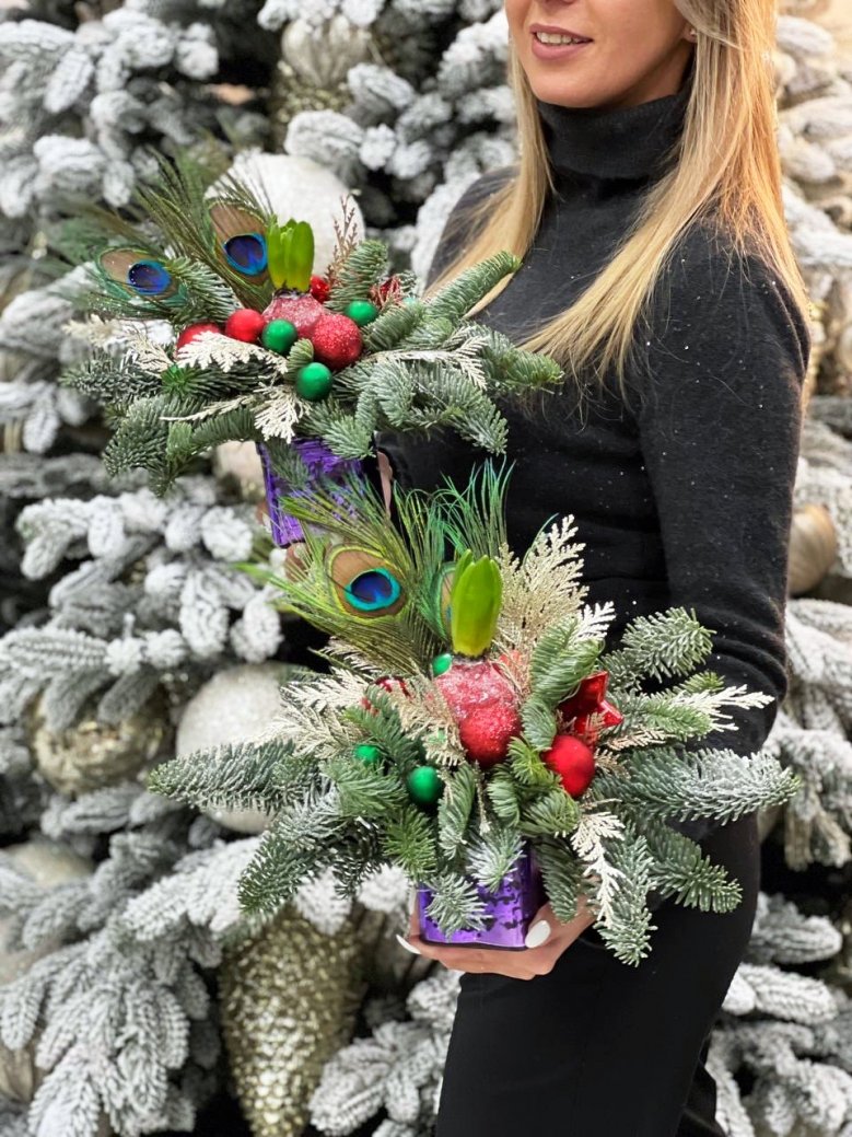 Состав: лапник голубой датской ели (нобилис), павлиньи перья, живые гиацинты и декоративные новогодние украшения