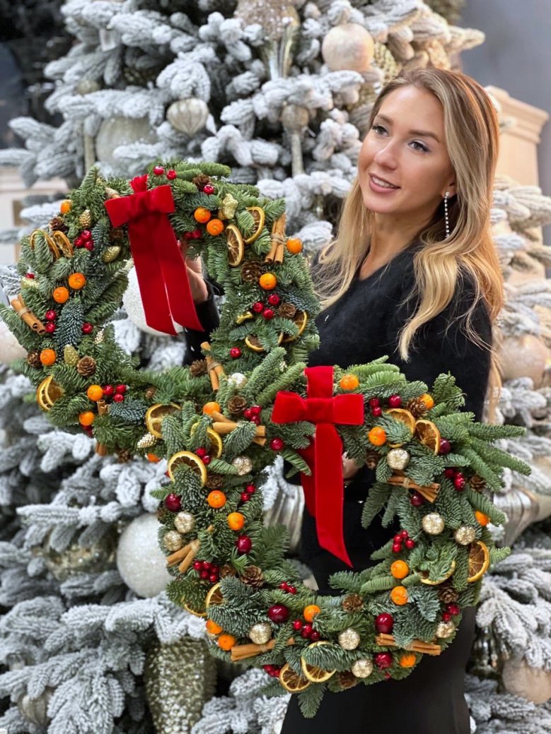 Состав: лапник голубой датской ели (нобилис), натуральные апельсины, палочкикорицы и декоративные новогодние украшения
