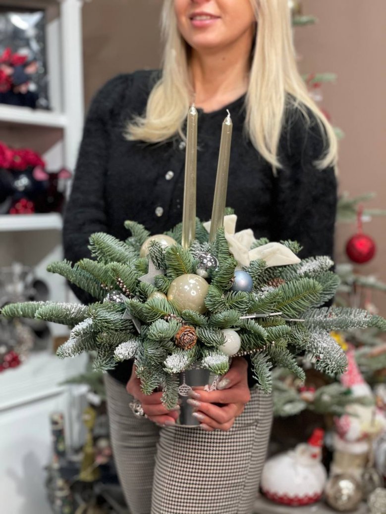 Серебряная праздничная композиция займет почетное место в центре стола и наполнит пряным ароматом комнату. Свечи в сердце нее озарят Вас и Ваших близки светом в новогоднюю ночь, чтобы вы успели загадать свое самое сокровенное желание под бой курантов.