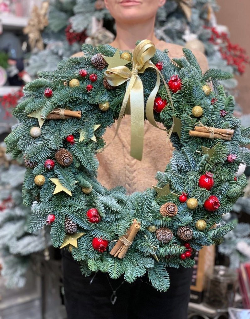 Праздничный венок из пушистой голубой ели, осыпанный золотыми звездами и блестящими шариками, станет отличным украшением для любой комнаты, он также будет встречать ваших гостей на двери, чтобы вы вместе смогли насладиться самым волшебным праздником в году.