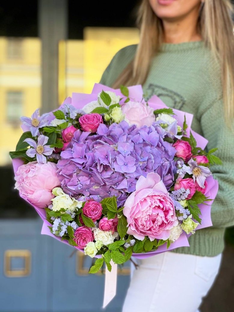 Букет цветов — гортензии, пионы и пионовидные розы