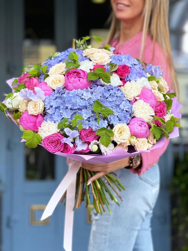 Букет цветов — гортензии, пионовидные розы и вибурнумы