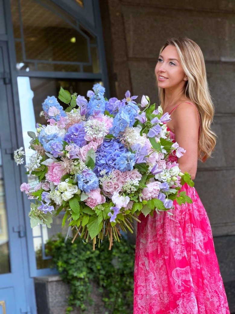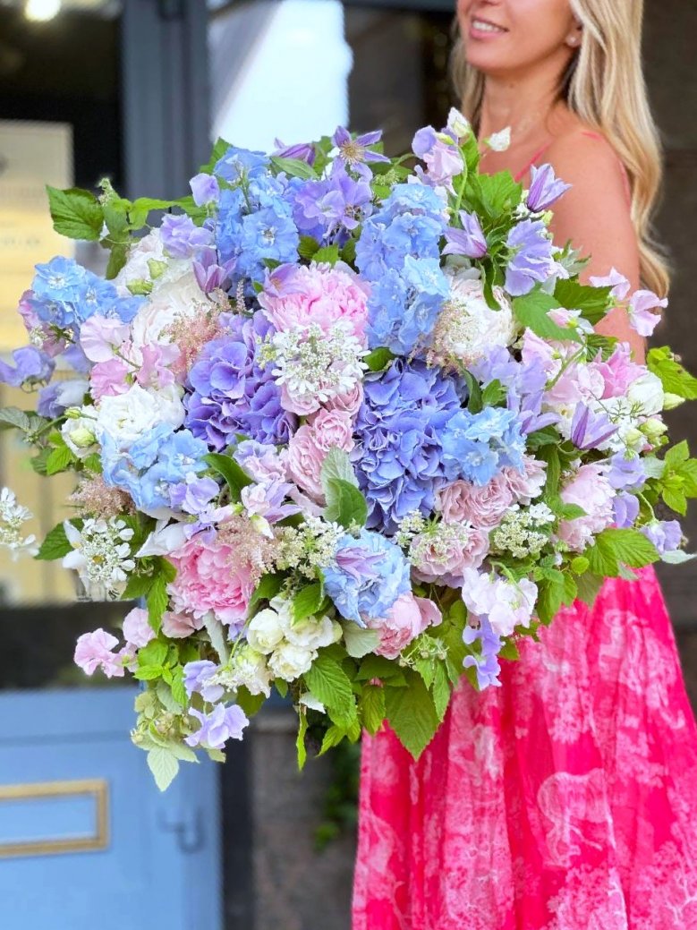 Букет цветов — гортензия, пионы, садовые розы и латирус