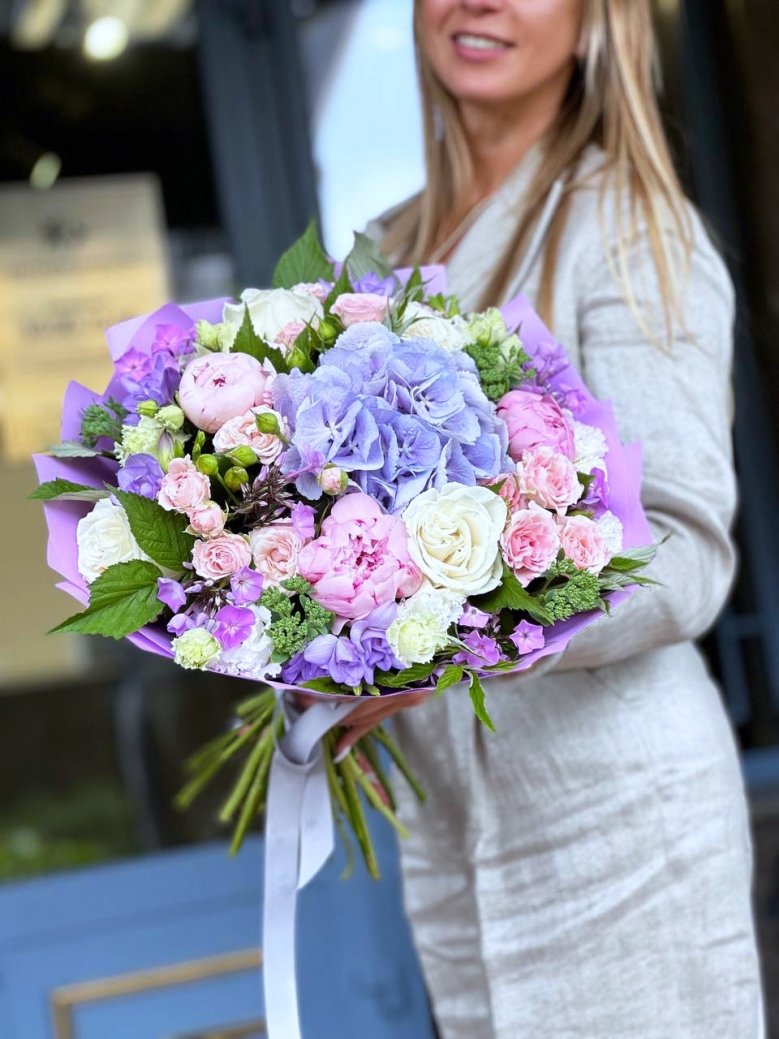 Букет цветов — гортензия, пионовидные розы, флоксы и пионы
