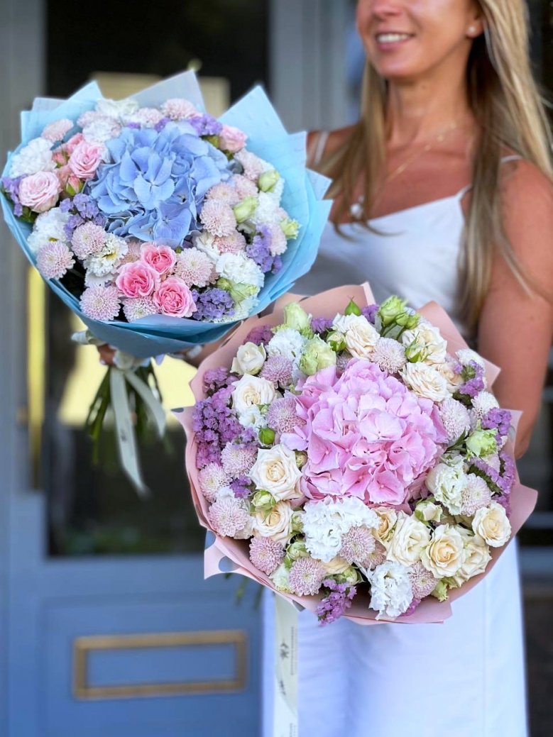 Букет цветов — гортензия, пионы, пионовидные розы и эустомы