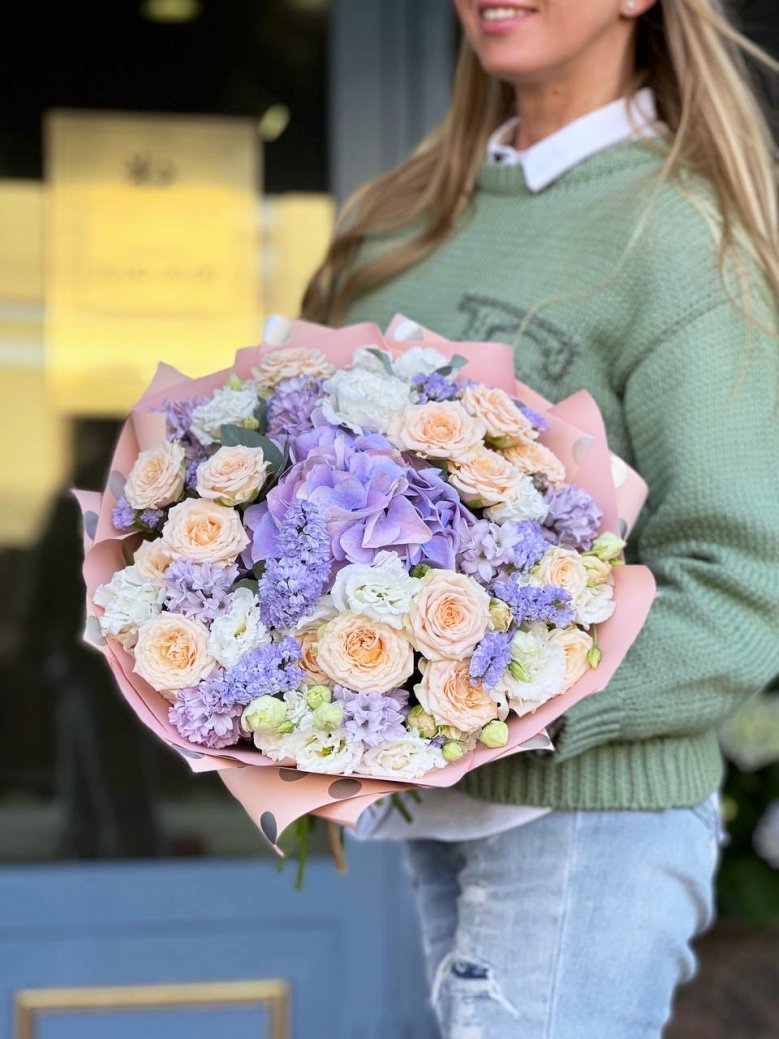 Букет цветов — гортензия, пионовидные розы, статицы и эустомы