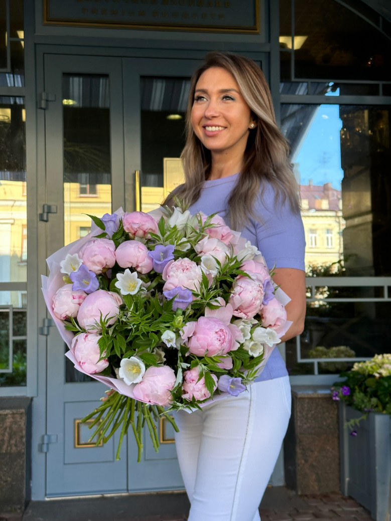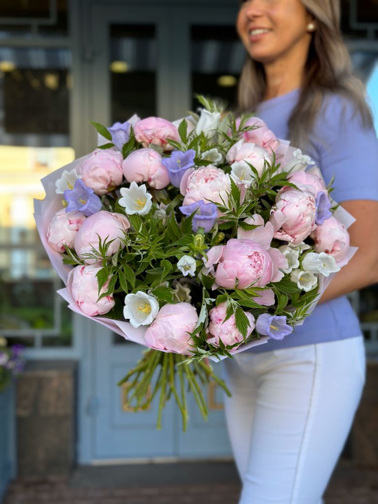 Заботливо собранный букет цветов — идеальное решение для особых случаев или ежедневного украшения интерьера. Ощутите непередаваемую энергию природы, приобретя прекрасный букет цветов — пионы, кампанула и зелень малины. Купите букет цветов и добавьте немного счастья в свою жизнь!
