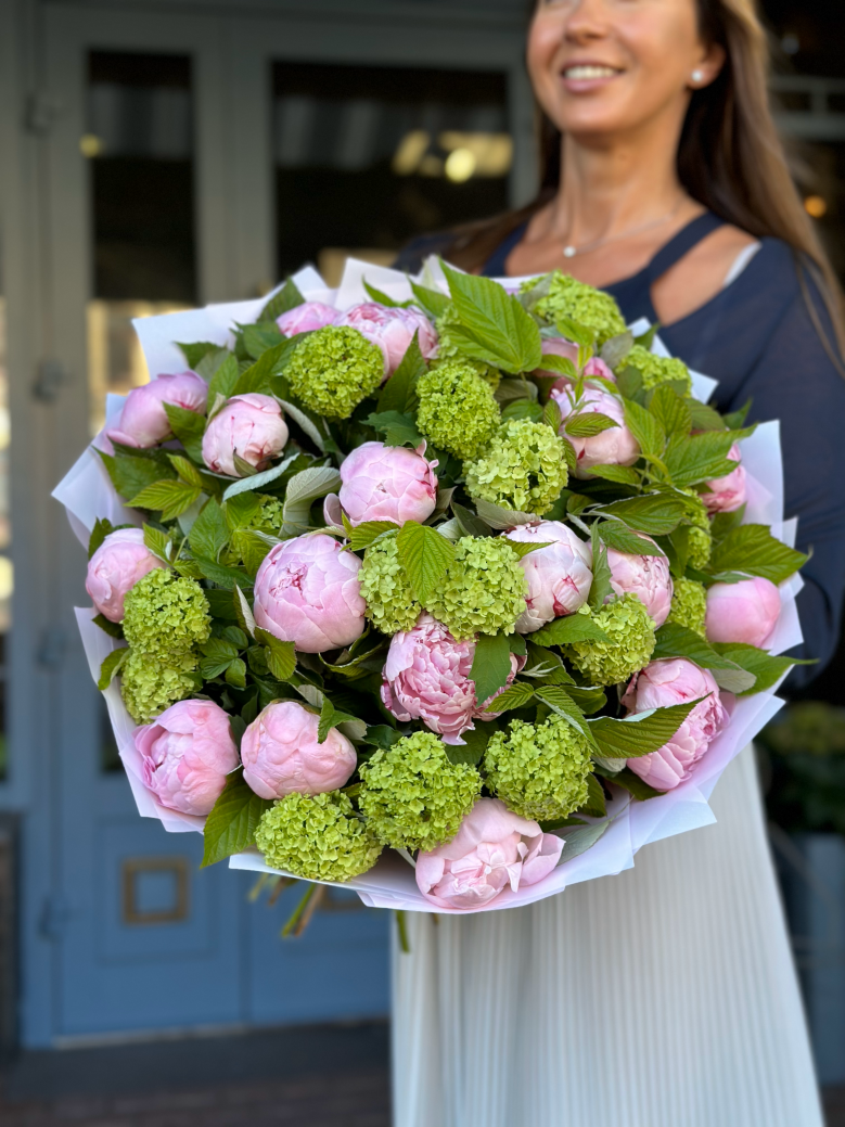 Изящная композиция из нежных пионов, словно облака свежести, наполняющих воздух тонким ароматом утончённости. Элегантные веточки вибурнума придают лёгкости и воздушного шарма, подчёркивая гармонию природного совершенства.