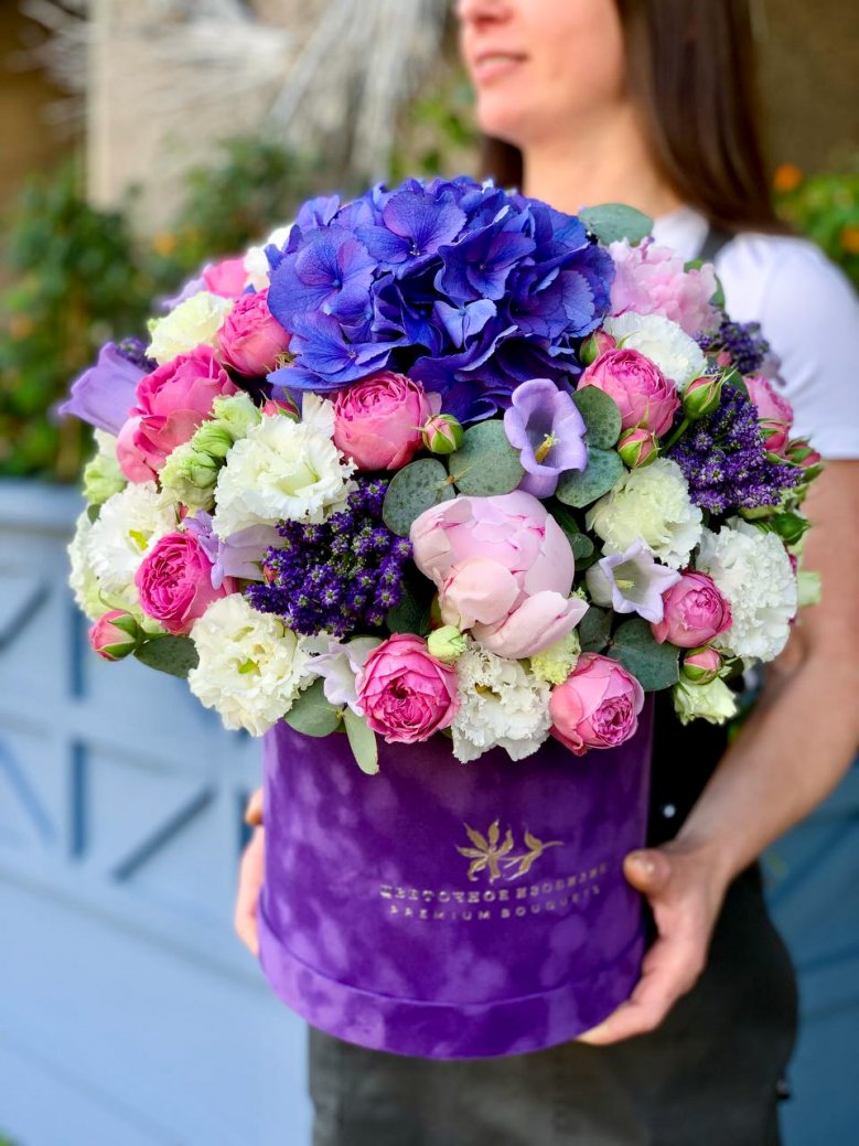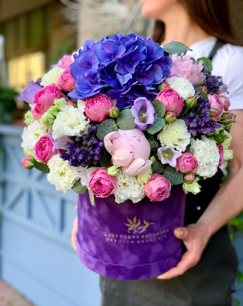 Композиция в шляпной коробке — гортензия, пионы, вероника и садовые розы (S, M, L)