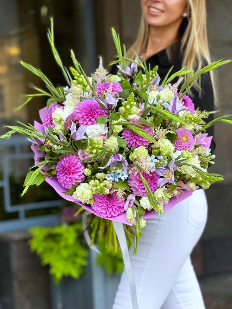 Авторский букет цветов — георгины, миниградиолусы, клематисы и голубые оксипеталумы