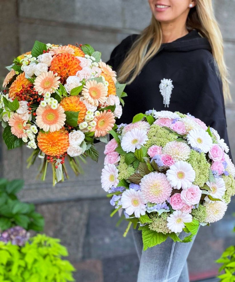 Букет цветов — маттиолы, пионовидные розы и белые флоксы