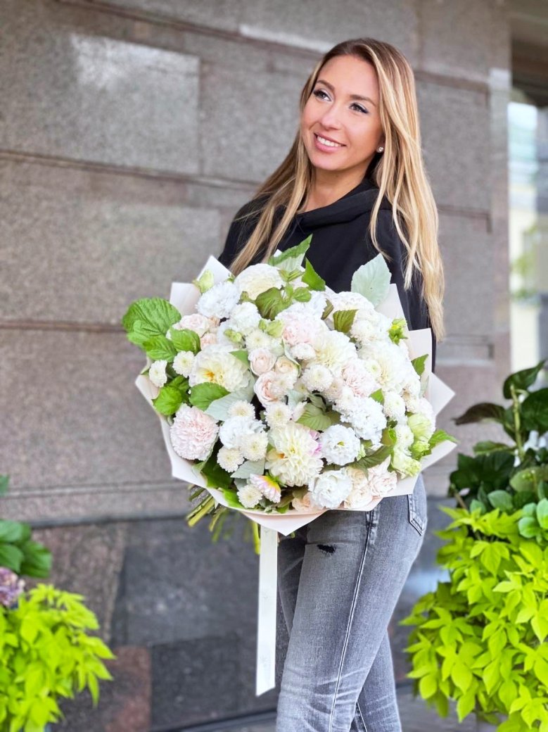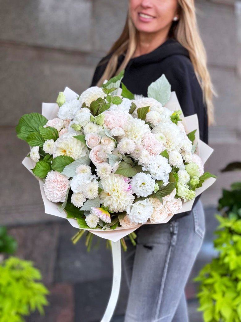 Букет цветов — георгины, пионовидные розы и эустомы