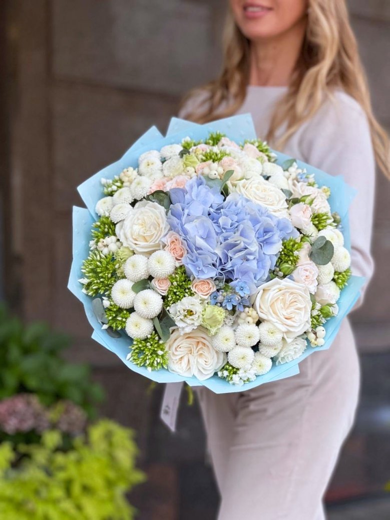 1. Каждый букет уникален и имеет сезонность, поэтому он может отличаться от того, который вы видите на картинке. Мы можем создать композицию в подобном стиле и цвете.