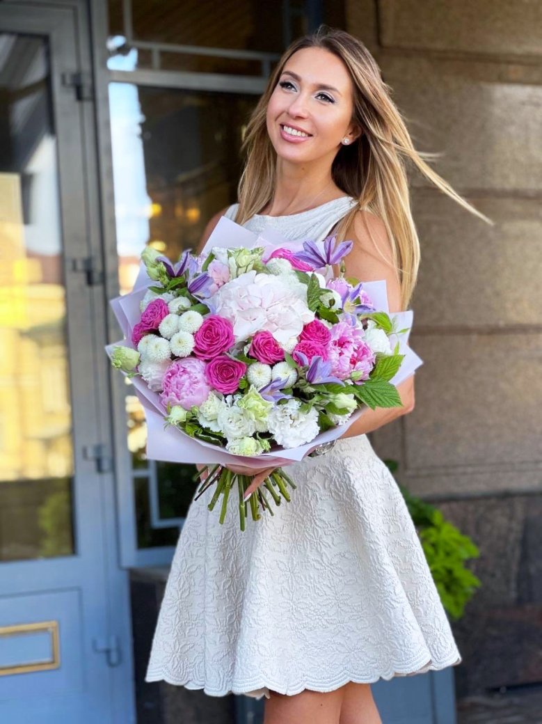 Букет цветов — пионы, садовые розы, клематисы и гортензия