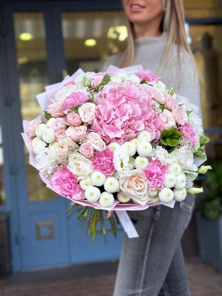 Состав: пионовидная роза, гвоздика, гортензия и сантини