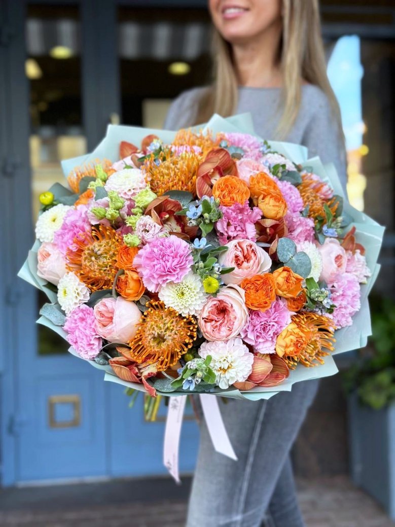 Букет цветов — пионовидные розы, орхидеи, ранункулюсы и целозия