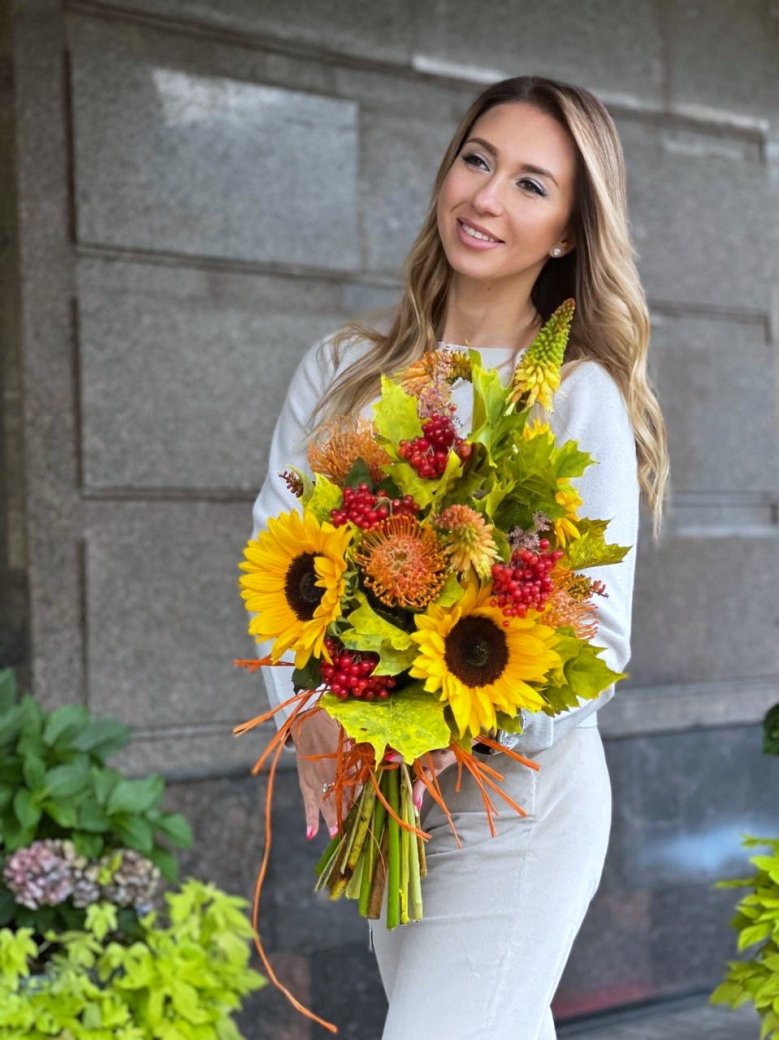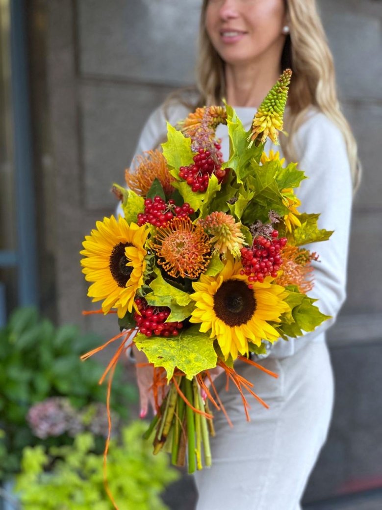 Букет цветов — подсолнухи, кверкусы, калина и леукосперумы