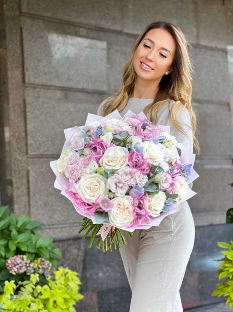 Букет цветов — садовые розы, кампанулы и розовая нерине