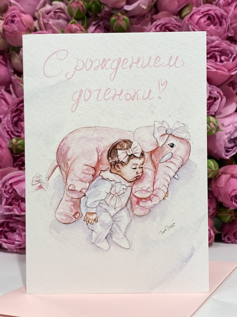 Открытка авторская с конвертом «С рождением доченьки» Вы можете заказать на сайте салона Цветочное изобилие. Цена 400 руб.