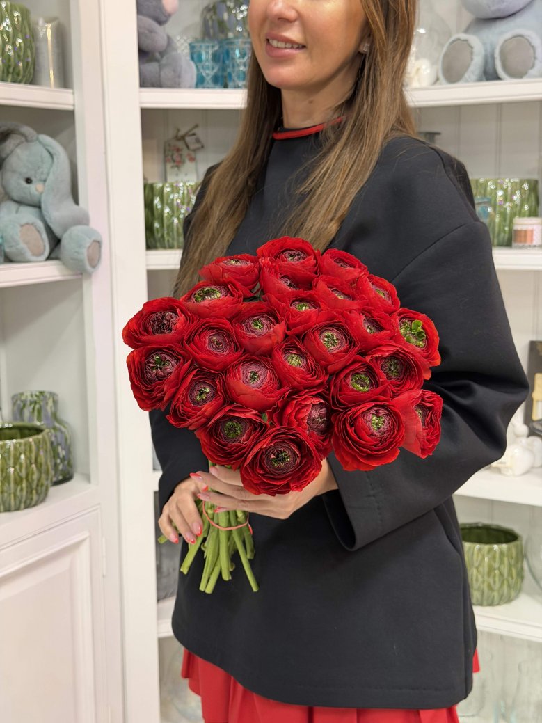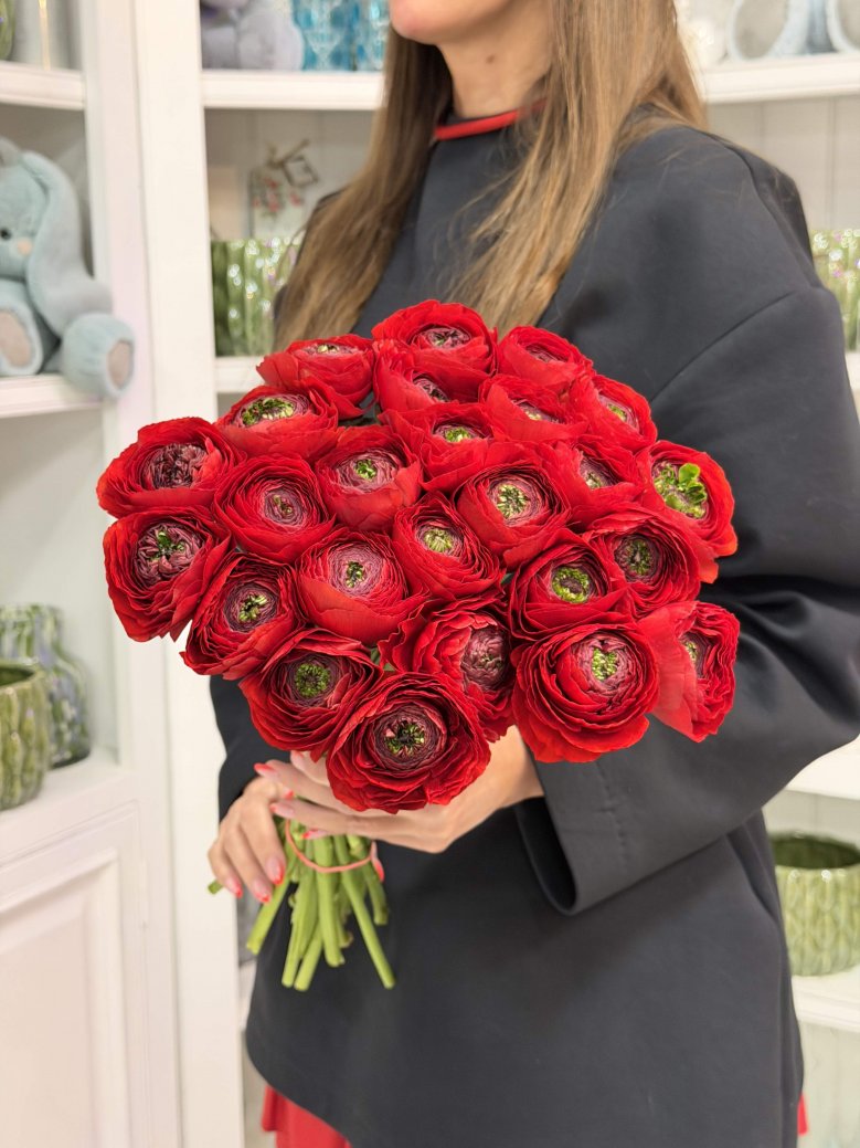 Букет из 25 красных итальянских ранункулюсов Вы можете заказать на сайте салона Цветочное изобилие. Цена 23 400 руб. В составе букета только свежие цветы, которые не завянут через несколько дней. Все цветочные композиции, представленные на сайте, являются авторскими. Каждый букет мы собираем учитывая все Ваши пожелания.