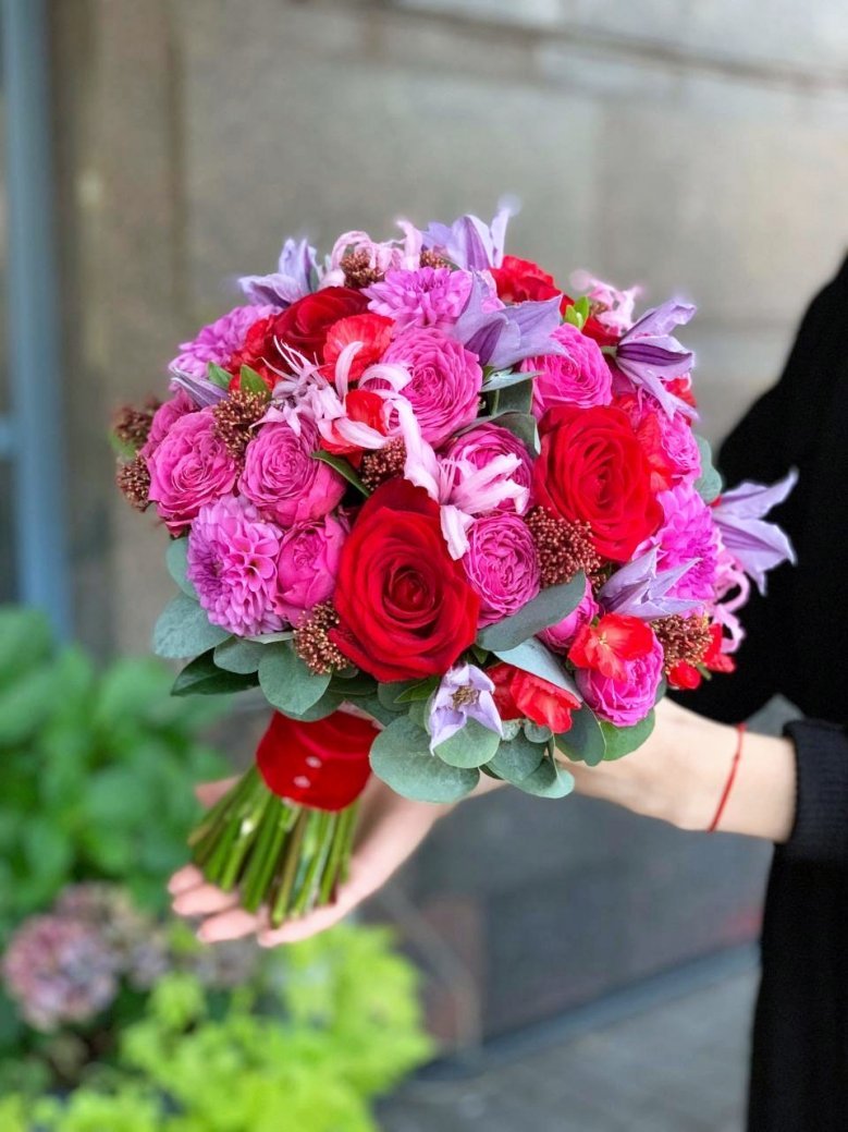 Авторский букет невесты — пионовидные розы, георгины, садовые розы и клематисы