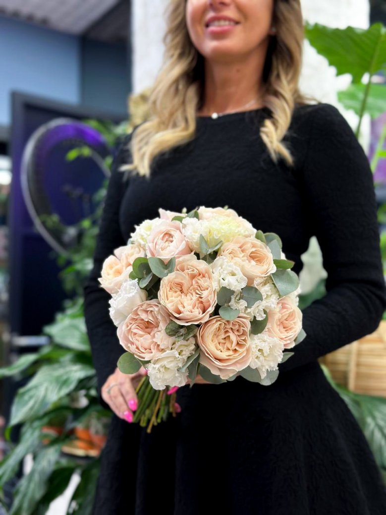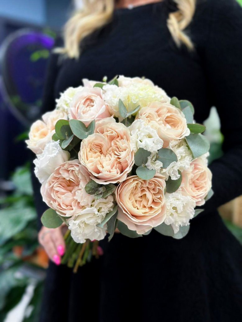 Свадебный букет цветов — пионовидная роза, эустома и эвкалипт
